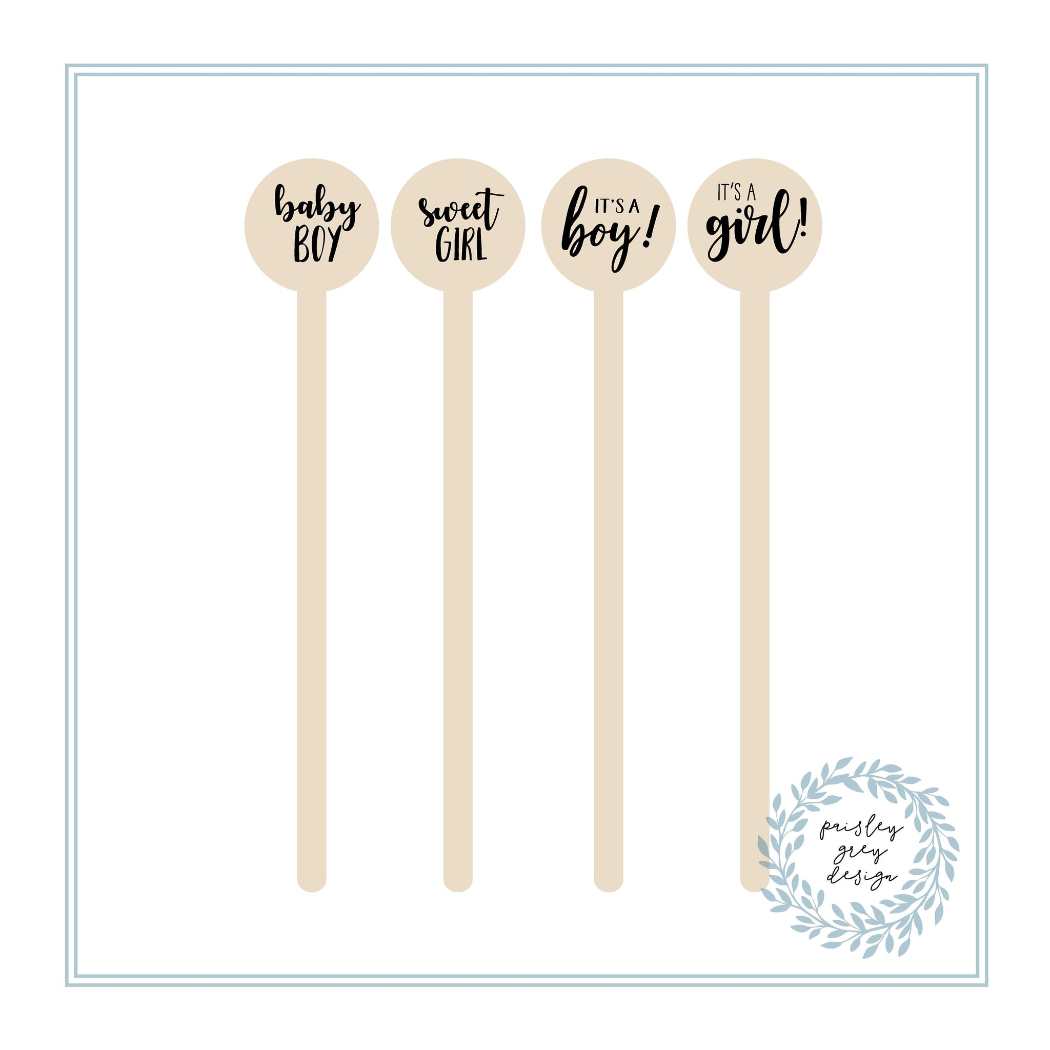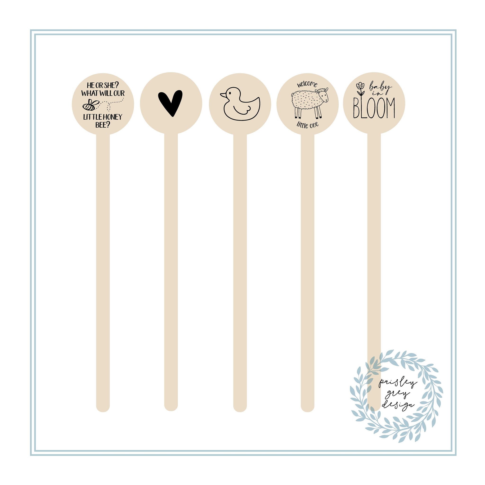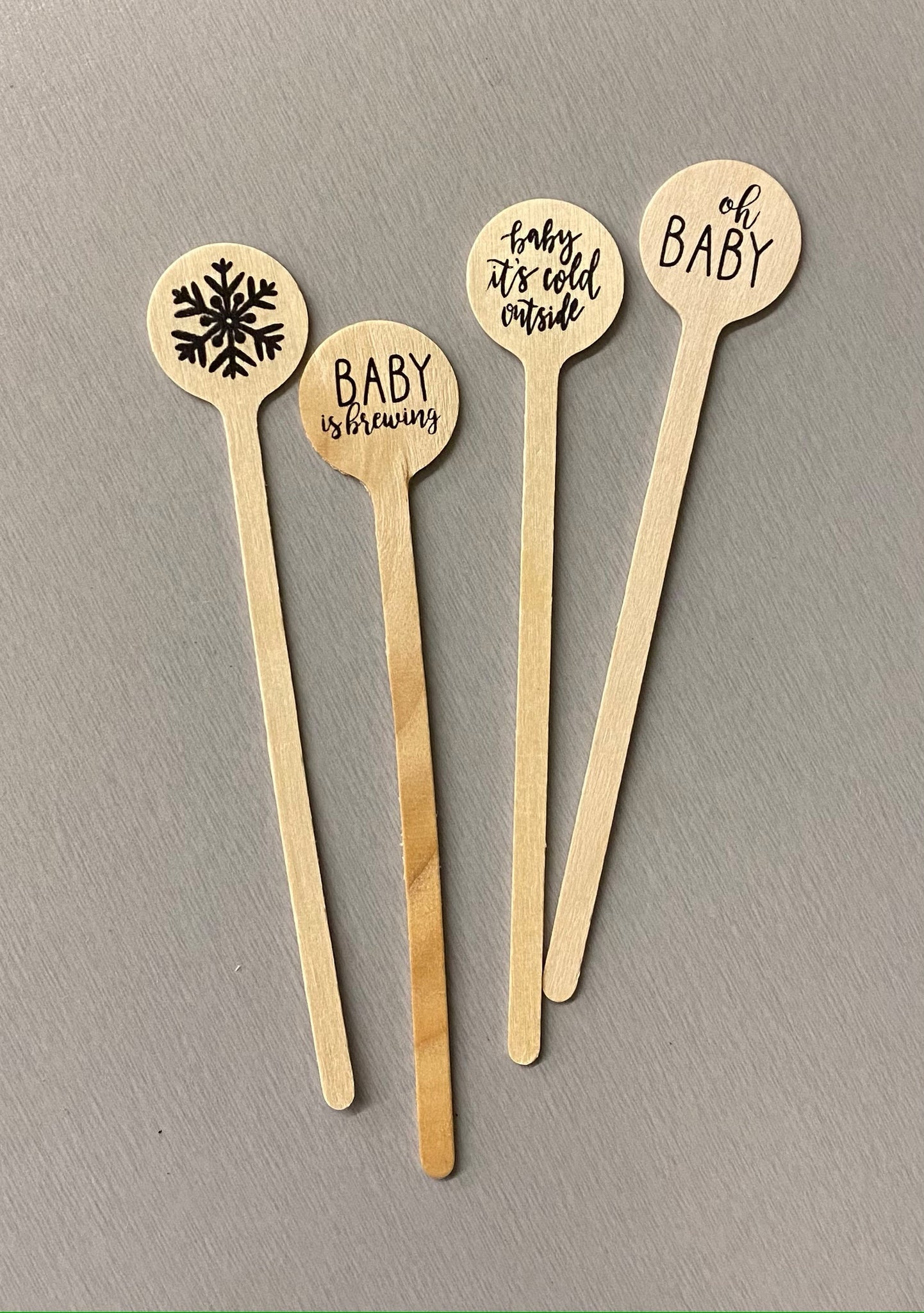 Main listing photo shows standard print baby and cold themed wooden picks; please use drop downs to select quantity. (LISTING PHOTOS ALSO SHOW CUSTOM STYLES, WHICH CAN BE FOUND IN ANOTHER LISTING AND INCUR AN ADDITIONAL FEE FOR CUSTOMIZATION).