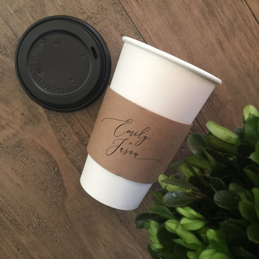 Personalized Natural Brown Kraft Custom Coffee Sleeve, White Cups and Black Lids - Script Name + Name Graphic - Wedding - Party - Shower