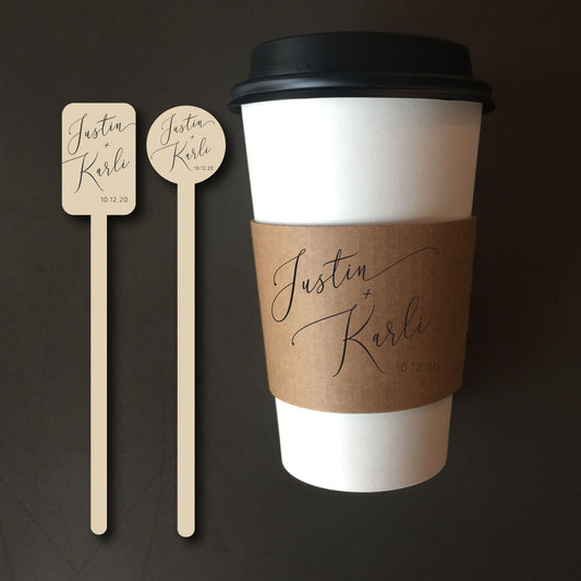Personalized Natural Brown Kraft Coffee Sleeves Optional Cups & Lids - Optional Stirrers - Script Name + Name - Wedding - Shower - Party