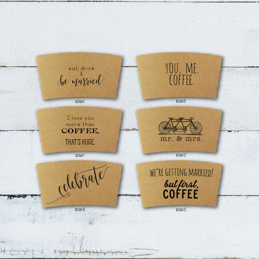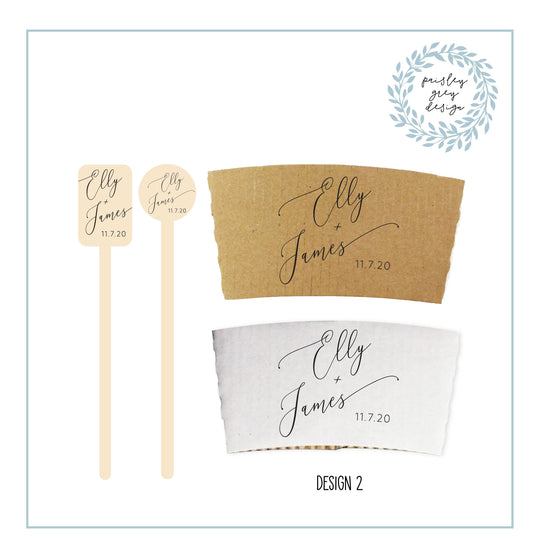 Set Natural Kraft Coffee Sleeves Brown or White and Custom Wood Stir Sticks - Any Shop Design - Wedding - Shower - Birthday - Gift