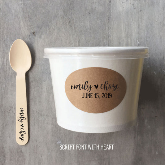 Custom Label - 8 Ounce White Ice Cream Cup, Wooden Spoon and Recycled Brown Kraft Label - Free US Shipping