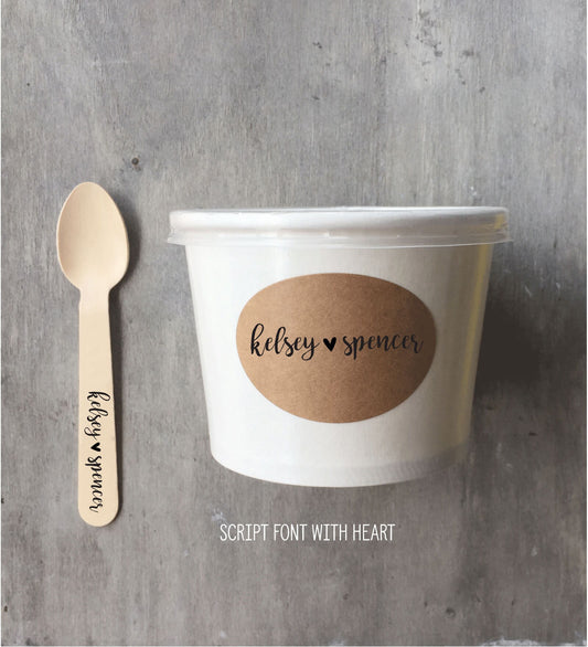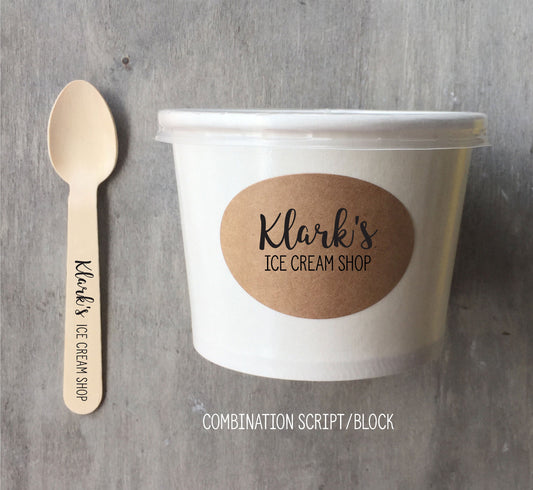 Custom Label - 8 Ounce White Ice Cream Cup, Wooden Spoon and Recycled Brown Kraft Label - Free US Shipping