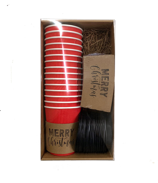 Gift Pack - Holiday - Christmas Corporate Housewarming - Natural Brown Kraft Coffee Sleeves, Holiday Red Cups & Black Lids - Merry Christmas