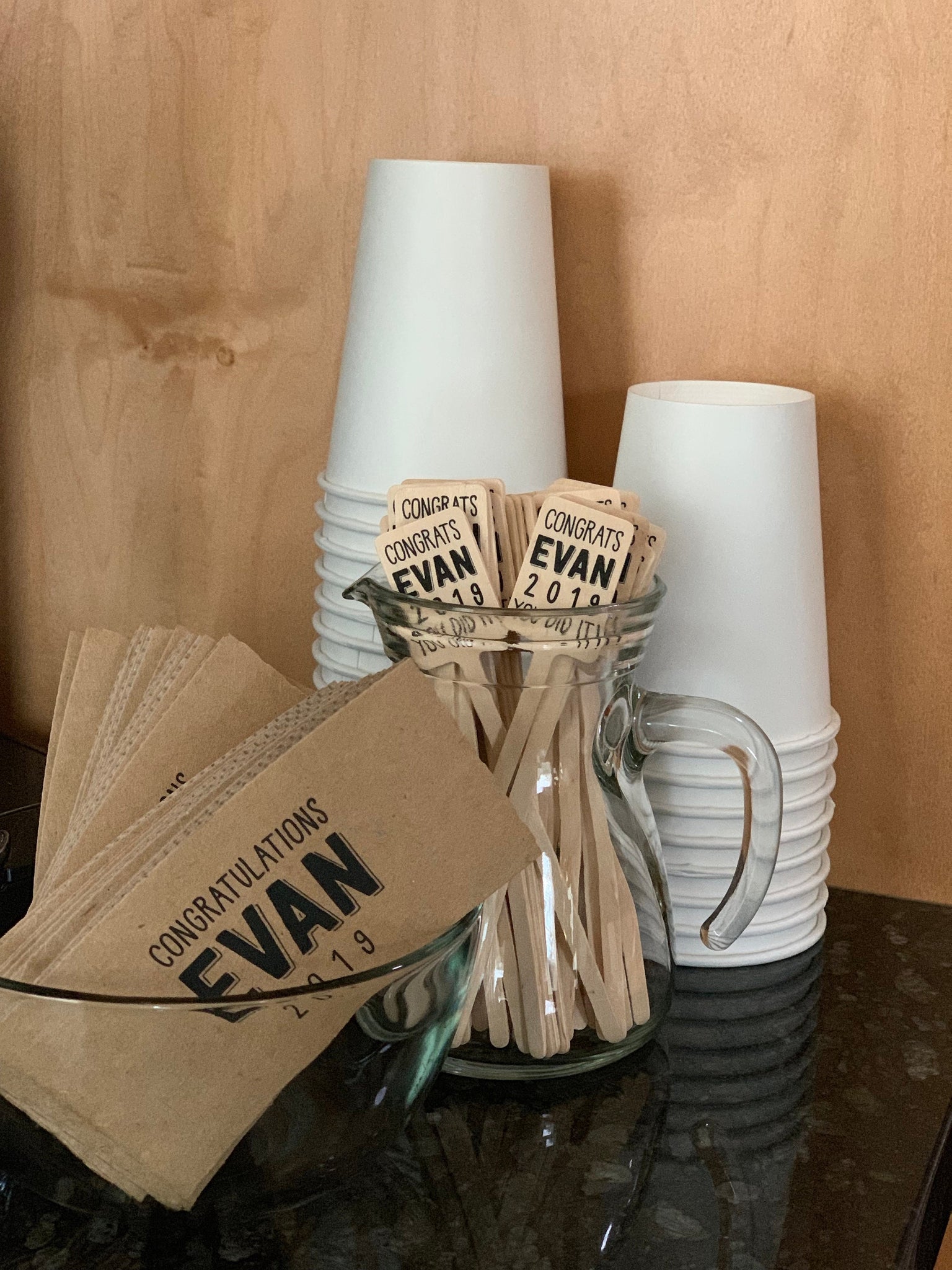 These are great for corporate event! For higher quantities, please email us in advance for pricing and lead times. We can personalize these with your phrase, your logo or graphic, or will work with you to make a custom graphic or text design. We also offer printed wooden utensils, napkins and stirrers to match!