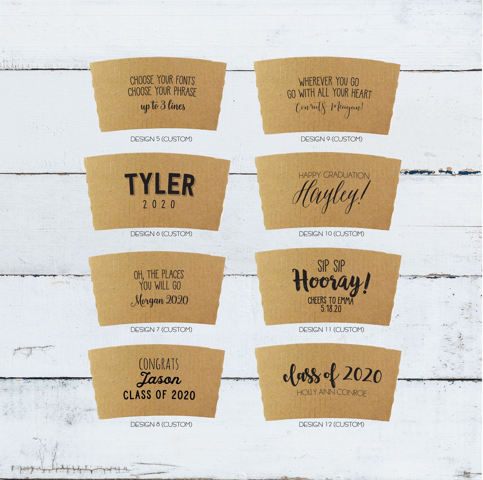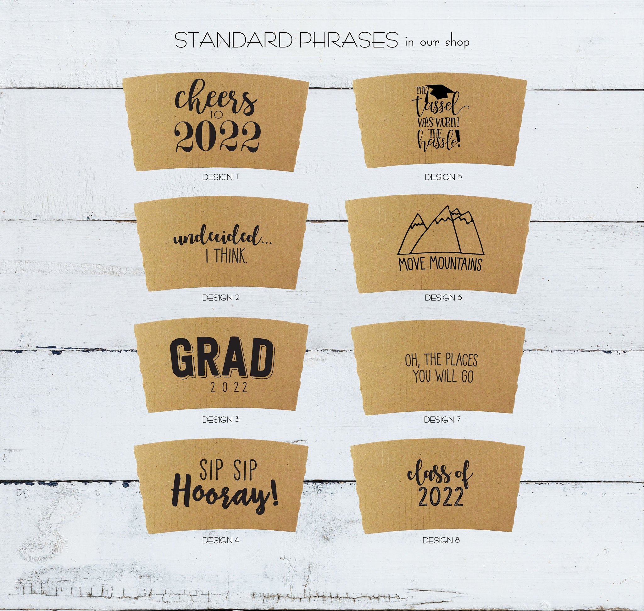 GRADUATION Themed Natural Brown Kraft Coffee Sleeves, White Cups, Black Lids - Standard Graphic Choice